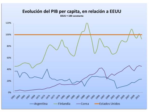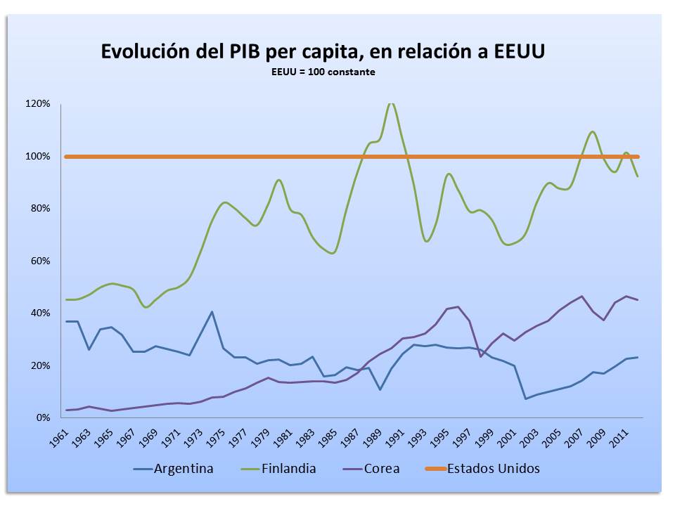 Los países como la República de Corea en los ´60 o Finlandia a principios de la década del ´90, supieron transformar su economía dependiente de sus recursos naturales, integrándola con otra orientada hacia las exportaciones industriales de alta tecnología, donde la adquisición de capacidad tecnológica fue central para permitirles tener un cierto poder sobre la demanda y su precio. Sus resultados lo podemos observar en el siguiente gráfico, donde comprobamos su crecimiento con respecto a la economía de EEUU.